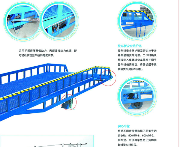 移動式登車橋是與叉車配合使用的貨物裝卸輔助設備,可根據(jù)貨車車廂的高低調(diào)節(jié)高度,叉車可以直接通過本設備駛?cè)胲噹麅?nèi)部進行貨物的批量裝卸,僅需單人作業(yè),即可實現(xiàn)貨物的快速裝卸。它的菱形網(wǎng)狀結構,充分保證了卓越的防滑性能,使叉車有極好的爬坡性和可操縱性。即使在雨、雪天氣,仍能保證正常使用。它的可調(diào)節(jié)長度的索鏈能方便地鉤住貨車,使登車橋與貨車始終緊密貼合。采用手搖液壓泵作動力,不需外接動力電源即可輕松實現(xiàn)登車橋的高度調(diào)節(jié)。配置的剎車墊可有效防止貨車裝卸時登車橋移位。